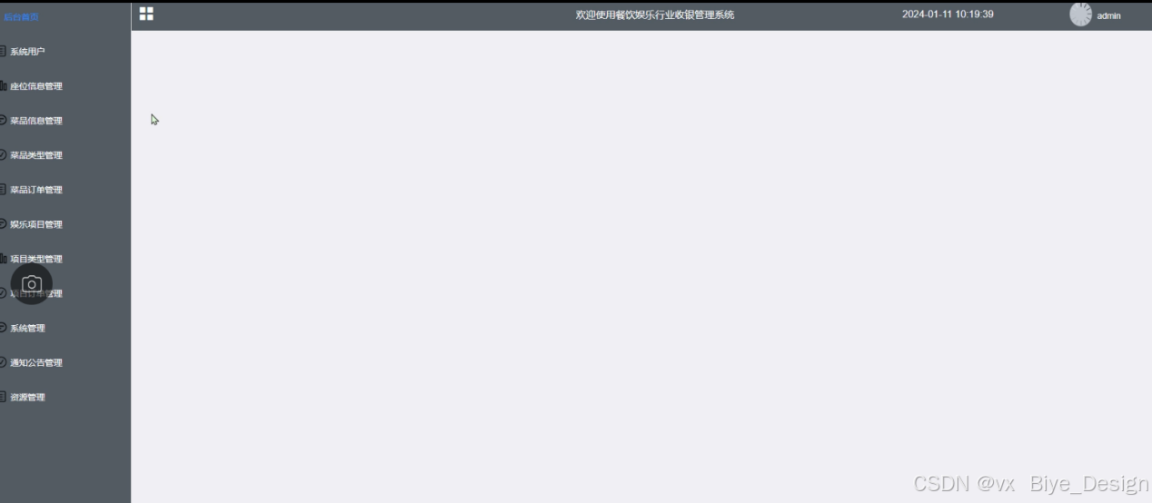 管理员登录进入基于springboot 餐饮娱乐行业收银管理系统时可以查看系统用户、座位信息管理、菜品信息管理、菜品类型管理、菜品订单管理、娱乐项目管理、项目类型管理、项目订单管理、系统管理、通知公告管理、资源管理等功能内容。如图5-2所示。