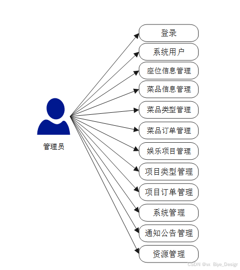 web后台管理上的管理员是维护整个基于springboot 餐饮娱乐行业收银管理系统中所有数据信息的,管理员可以进行登录管理首页、系统用户(管理员、注册用户)、菜品信息管理、菜品类型管理、菜品订单管理、娱乐项目管理、项目类型管理、项目订单管理、座位信息管理、系统管理、通知公告管理、资源管理等。管理员角色用例如图3-2所示。