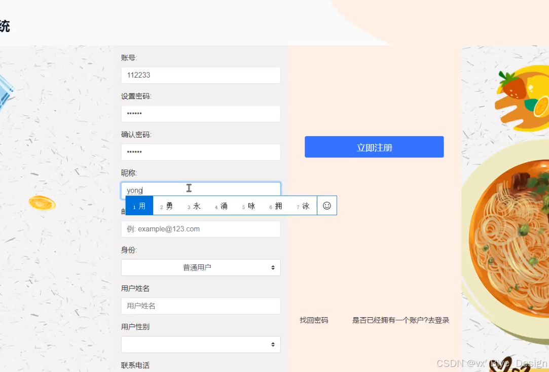 用户在注册页面填写账号、密码、确认密码、昵称、邮箱、手机号、身份进入等信息系统,如图5-8所示。