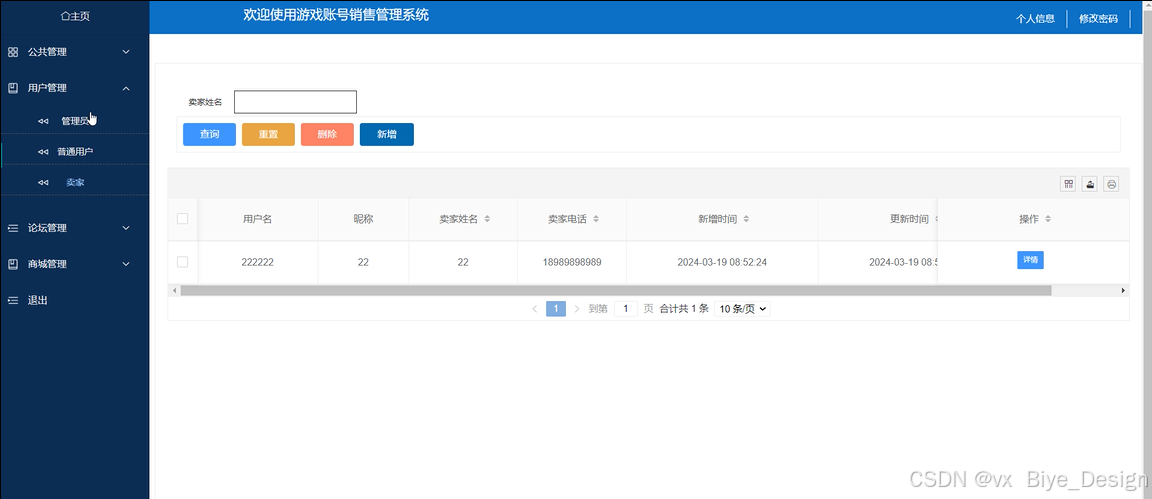 基于SSM的游戏账号销售管理系统中的管理人员是可以对注册的普通用户、卖家用户进行管理的,也可以对管理员进行管控。界面如下图4-8所示。