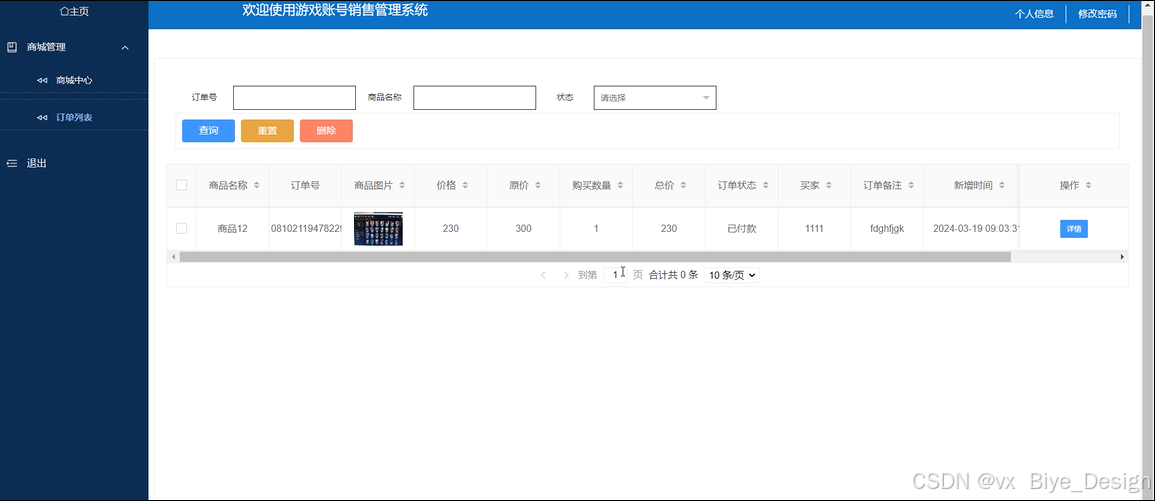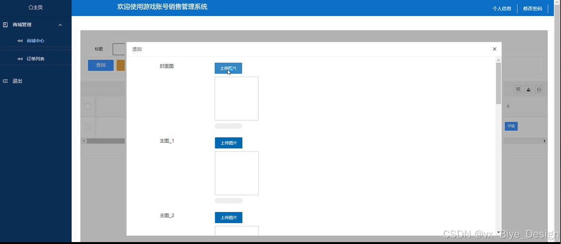 管理员点击“商城中心”菜单,可以管理游戏账号的信息,包括添加、编辑和下架游戏账号。界面如下图所示。