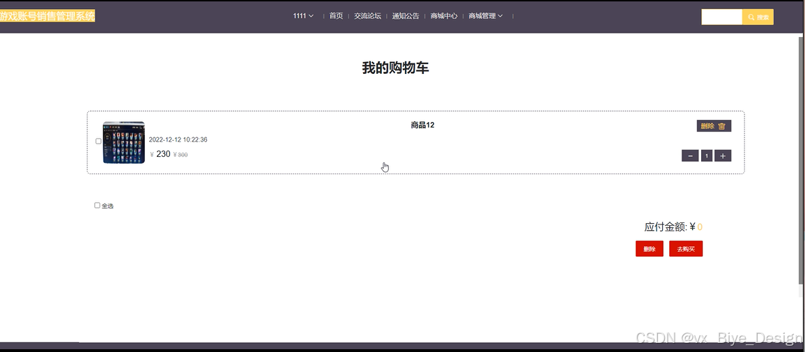 用户可在商品详情页面点击“加入购物车”,可以将喜欢的商品加入购物车,用户可以管理自己的购物车,包括添加商品、修改数量、删除商品等操作。界面如下图所示。