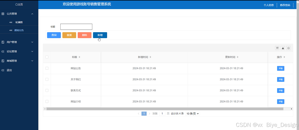 The system mainly includes the following core modules: communication forum, notification announcement, mall center, and mall management. The communication forum module allows users to post and browse discussions related to game account transactions, enhancing interaction and communication between users. The notification and announcement module is used to publish important information such as system updates and transaction reminders, ensuring that users receive the latest news in a timely manner.