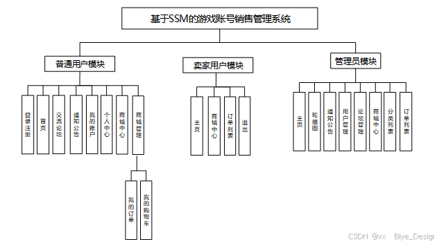 按照基于SSM的游戏账号销售管理系统的角色,系统划分为了普通用户模块、卖家用户模块和管理员模块这两大部分。