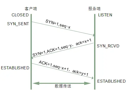 - 第一次握手:客户端给服务端发一个 SYN 报文,并指明客户端的初始化序列号 ISN。此时客户端处于 SYN_SENT 状态。