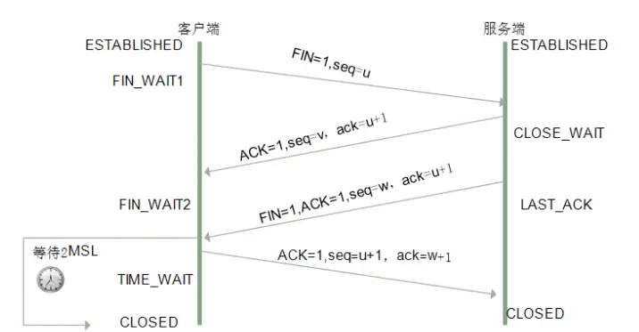 即客户端收到服务端的连接释放报文段后,对此发出确认报文段(ACK=1,seq=u+1,ack=w+1),客户端进入TIME_WAIT(时间等待)状态。此时TCP未释放掉,需要经过时间等待计时器设置的时间2MSL后,客户端才进入CLOSED状态。