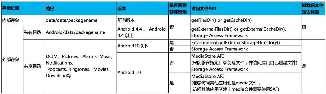(1)应用私有目录:存储应用私有数据,外部存储应用私有目录对应Android/data/packagename,内部存储应用私有目录对应data/data/packagename;
