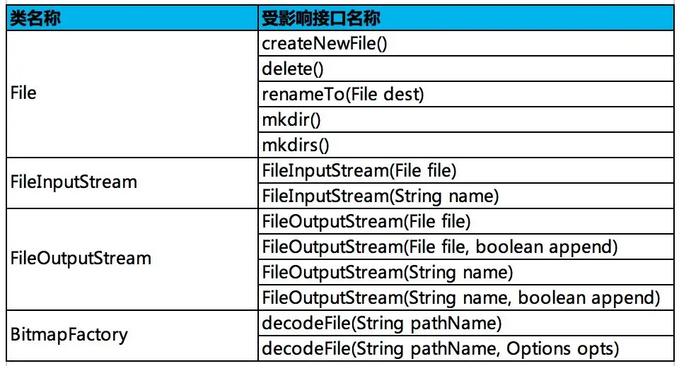 开启分区存储新特性, Andrioid 10不能够通过File Path路径直接访问共享目录下资源,以下接口通过File 路径操作文件资源,功能会受到影响,应用需要使用MediaStore或者SAF方式访问