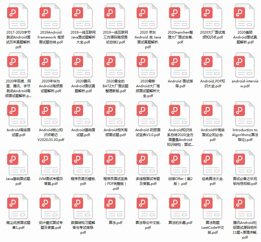 这里附上上述的面试题相关的几十套字节跳动,京东,小米,腾讯、头条、阿里、美团等公司21年的面试题。把技术点整理成了视频和PDF(实际上比预期多花了不少精力),包含知识脉络 + 诸多细节。