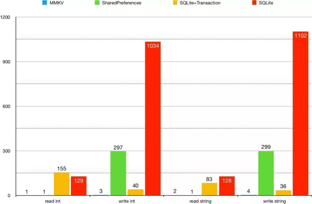 我们将 MMKV 和 SharedPreferences、SQLite 进行对比, 重复读写操作 1k 次。相关测试代码在 Android/MMKV/mmkvdemo/。结果如下图表。