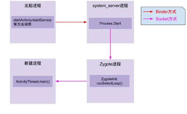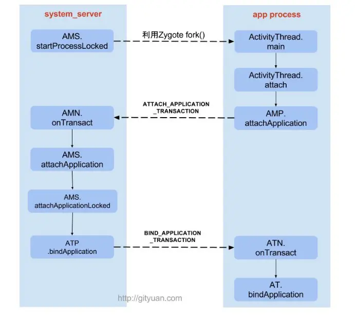 App与AMS通过Binder进行IPC通信,AMS(SystemServer进程)与zygote通过Socket进行IPC通信。后面具体介绍。