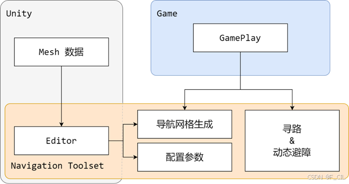 作为Unity package,本工具会涉及到与Unity引擎以及游戏交互,具体的架构如下图所示。本工具在图中用“Navigation Toolset”表示,其Editor部分内嵌在Unity引擎中,使得游戏开发人员可以方便地配置各项用于生成导航网格的参数。而导航网格的生成逻辑以及寻路和避障算法则是独立于引擎的模块,这也使得本工具能够方便地移植到其他游戏引擎中。
