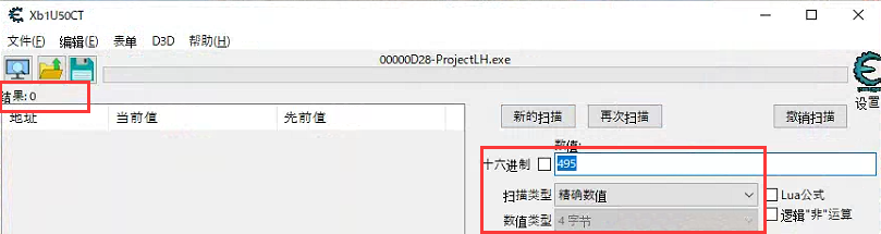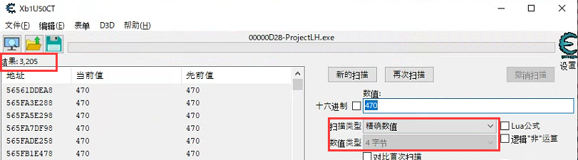 1.在验证之前,我们用CE先把当前血找出来,通过精确搜索就能很快搜索出来,非常简单就不一一说明了