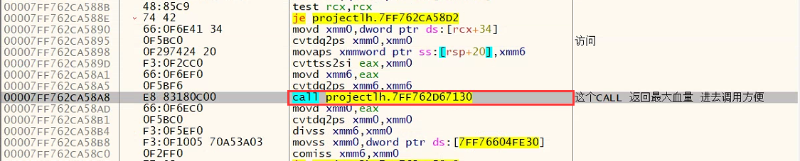 4.我们看到,这个CALL的参数很好调用,但是呢?看看返回值,发现最大血调用CALL后存在了xmm0中