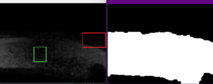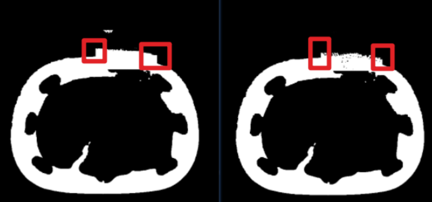 如图,红色框内属于边缘部分的伪影,绿色框是正常凹陷位置部分,但伪影的像素值原本大于正常凹陷中的部分,所以在Otsu阈值分割时,伪影也会被规划到前景中,所以处理后会出现下面这种情况: