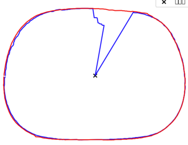 对当前轮廓(图中蓝色轮廓)和参考轮廓(图中红色轮廓)进行同步扫描。对于两个轮廓上相同θ的点的半径r,如果半径差大于设定的阈值,就认为是凹陷,如下图: