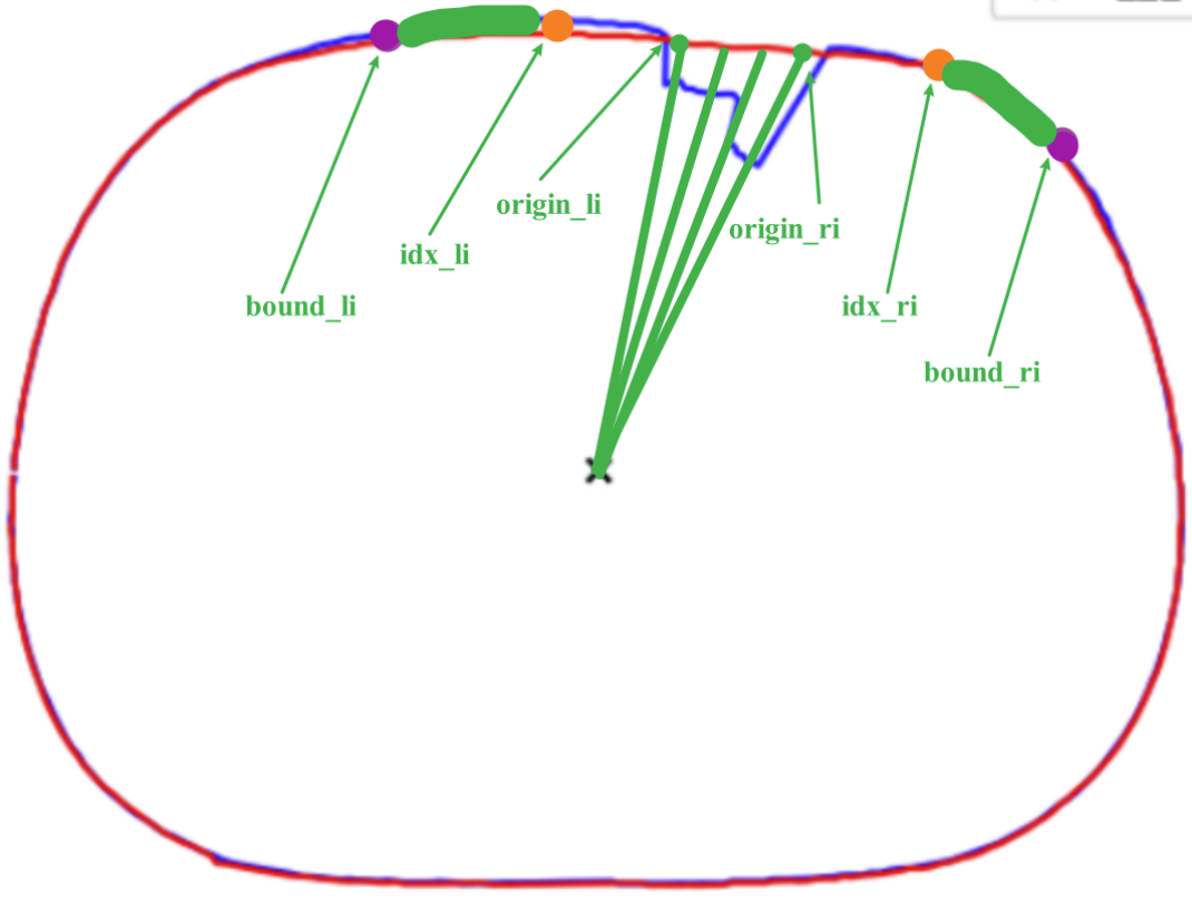 原先每个数组都是180个点。我们从在[180:360]范围内进行扫描,如果连续20个点mask都是false,那么用这段的右端点作为start,在区间[start:start+180]上进行操作。这样就会避免出现凹陷在数组0位置处。这里为什么要连续20个点呢?因为[bound_li:origin_li], [origin_ri:bound_ri]各自最多只有20个点,只会有一端出现在数组0附近,所以只需要20个点。