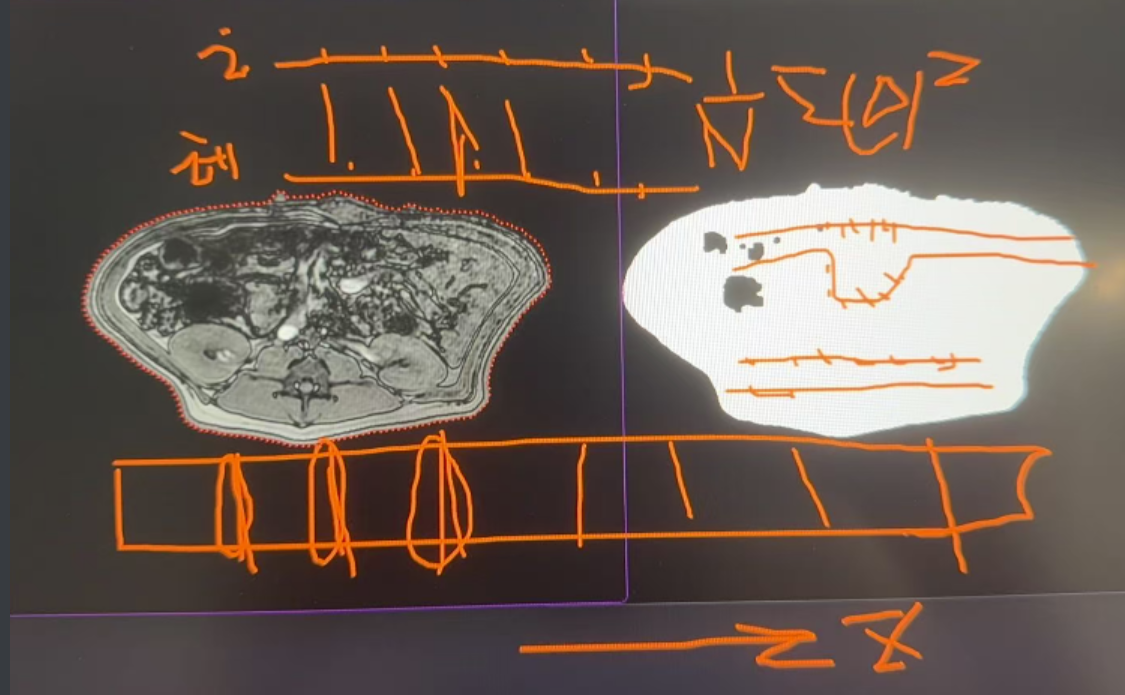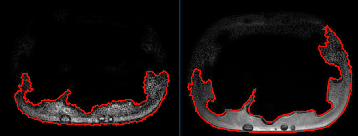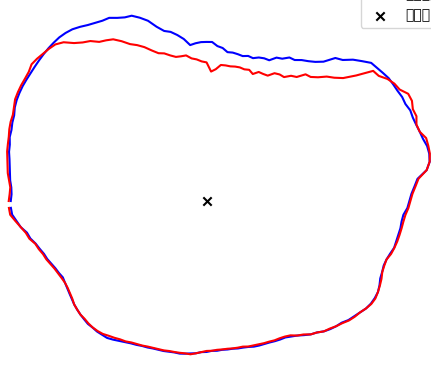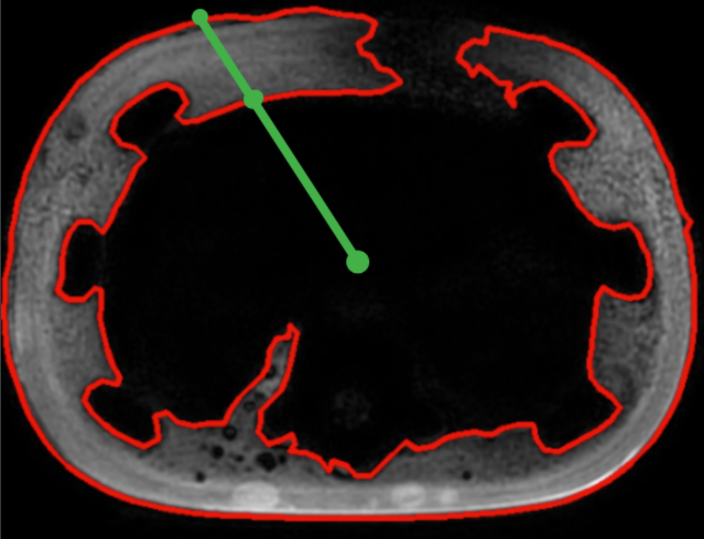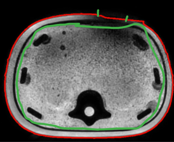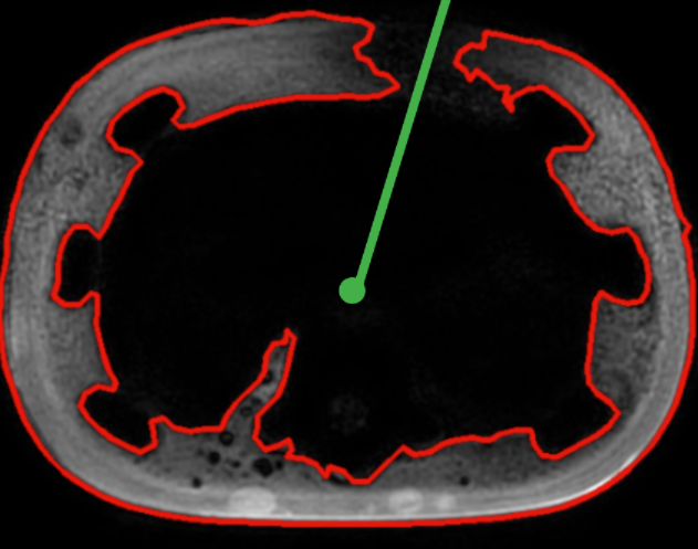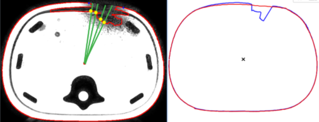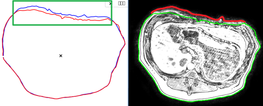在数据集中的后边影像中,身体部分正常向外扩招,如上图蓝色区域,此时这部分会被检测为凹陷异常,那么就会用参考轮廓替代原本的蓝色轮廓。而且这种情况是累积的,因为身体向外扩展可能是连续的,所以如果当前层扩展失败,那么后面的更会失败,半径差会越来越大: