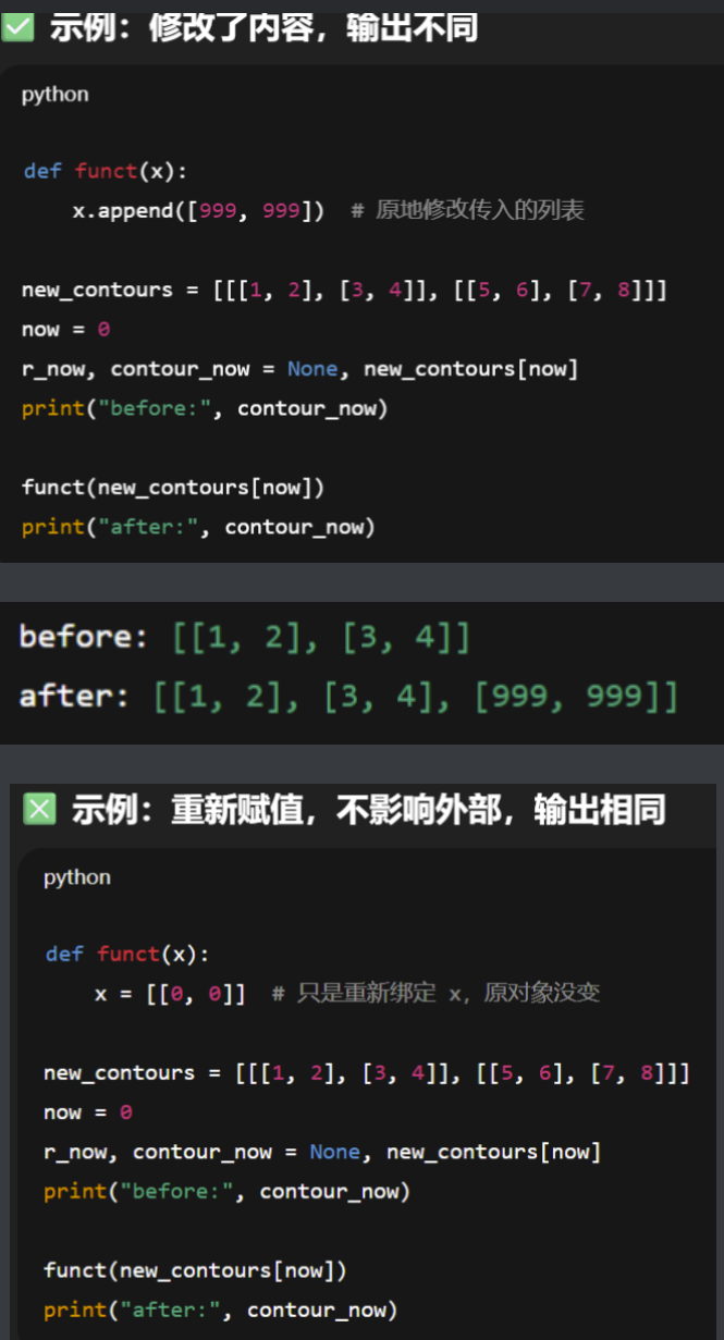 注意:这里是重新赋值,才不会影响外部。如果通过引用修改原本数据的值还是可以的,例如x[0] = 100.