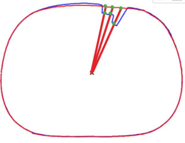 方案三是方案一和方案二的结合。我们找到凹陷位置之后,[origin_li,origin_ri],计算凹陷的宽度,如果宽度大于50°,此时曲线拟合方式生成的点就不准确了。就直接好用参考轮廓上的对应点替代。