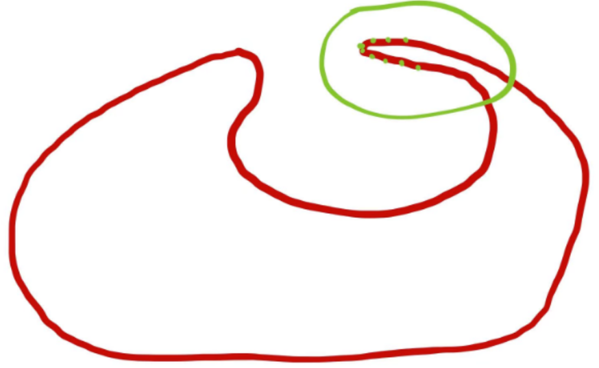 比如上图,外面的红色轮廓在绿色竖线部分是有缺口的,所以外面的轮廓就不完整,恰好里面绿色轮廓完整,而且和外面”不粘连“,所以扫描出来的结果最大轮廓是里面的轮廓。如下图所示: