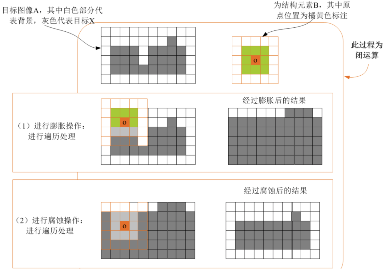 这里当时是通过在模糊处理之前加一个(7*7)的闭运算解决的。通过这个闭运算,内外部分会粘连到一起,不会出现完全分隔开的情况。根据开闭运算的原理,闭运算确实能填补内部的一些缝隙,而开运算则能消除内部的一些噪点,小黑洞,如下面两幅图: