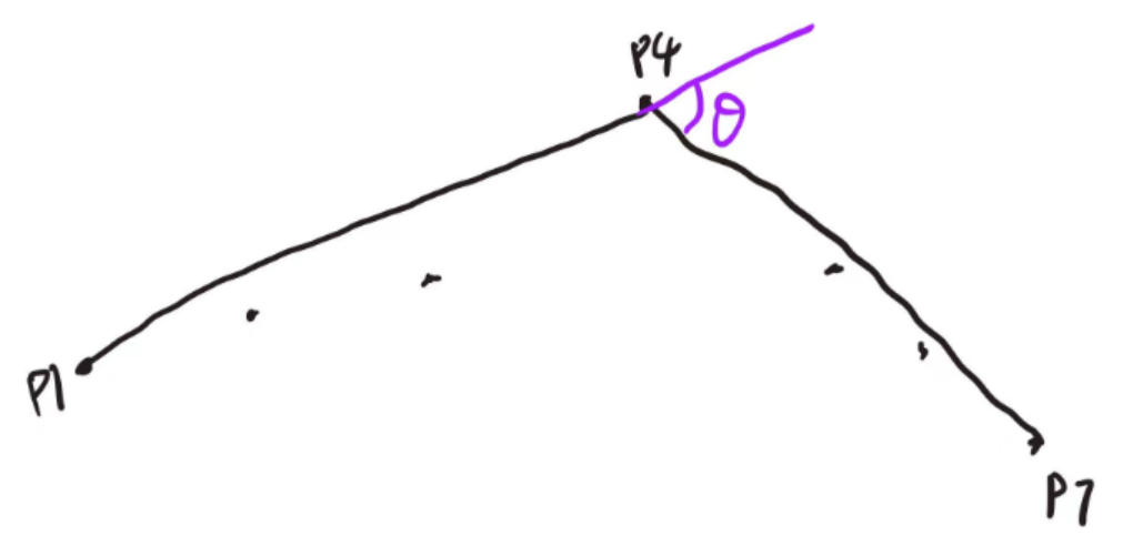 还有一种思路:即统计滑窗内七个点形成的线段的累计夹角,将夹角和与一个阈值做判断,但是如果遇到下面这种情况,就不可以:
