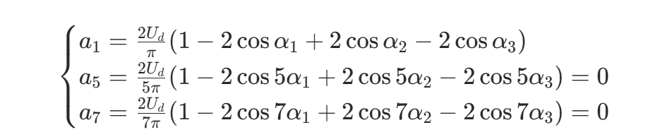 SHEPWM通过精确控制开关器件的通断时刻,直接消除特定低阶谐波(如3、5、7、9次)。其核心在于利用傅里叶级数展开构建非线性方程组,通过求解开关角度(如α₁、α₂、α₃)使目标谐波系数归零:
