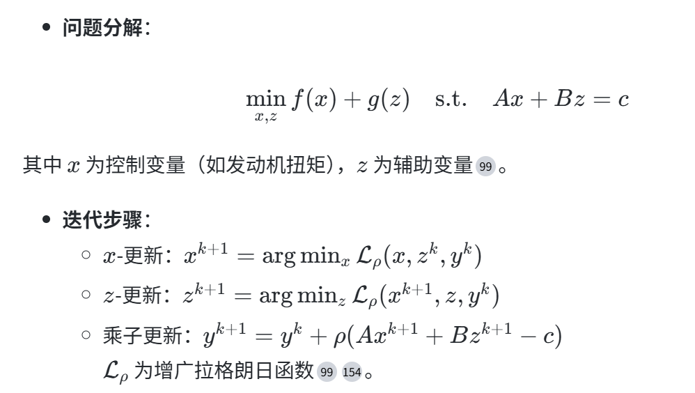 | ADMM | 分布式求解,内存占用低,长时域高效(≥1000) | 迭代次数多,精度中等 | 大规模约束问题 |