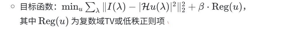 - 病态逆问题:强度观测 I(λ)=∣Hu(λ)∣2 丢失相位信息;