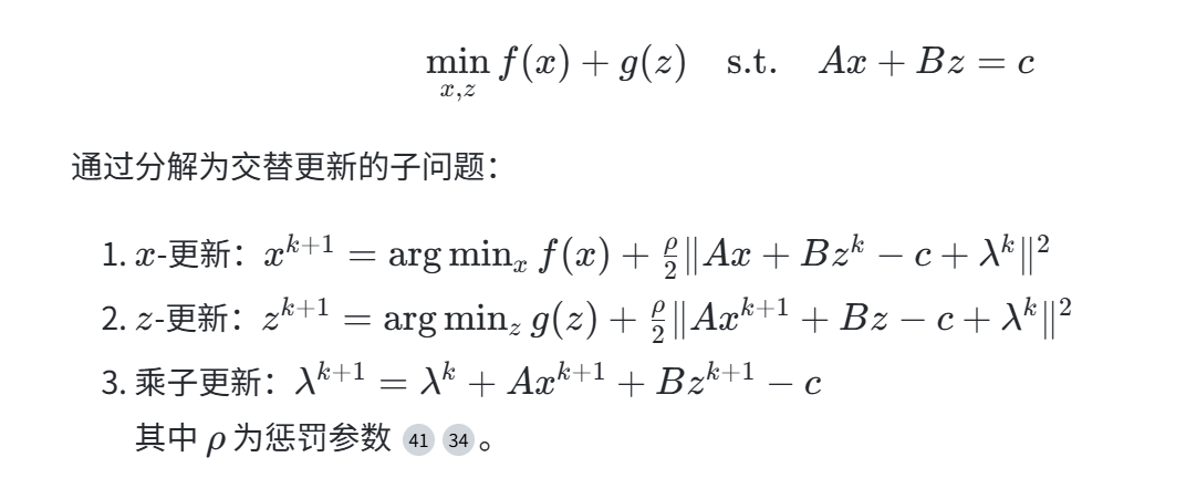 ADMM(交替方向乘子法)是解决带约束优化问题的高效框架,形式为: