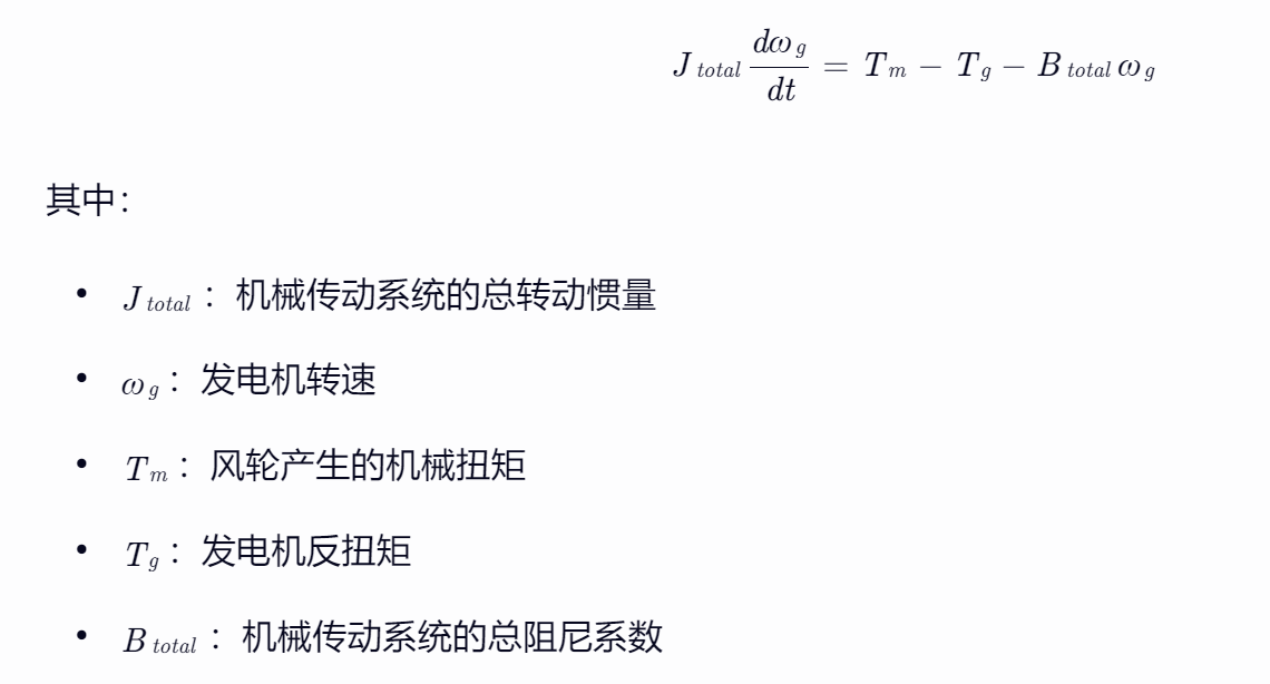 机械传动模型描述了风轮的机械能传递到发电机转子的过程。机械传动系统主要包括齿轮箱和连接轴。齿轮箱的作用是将风轮的低转速转换为发电机的高转速。机械传动系统的动态方程可以表示为: