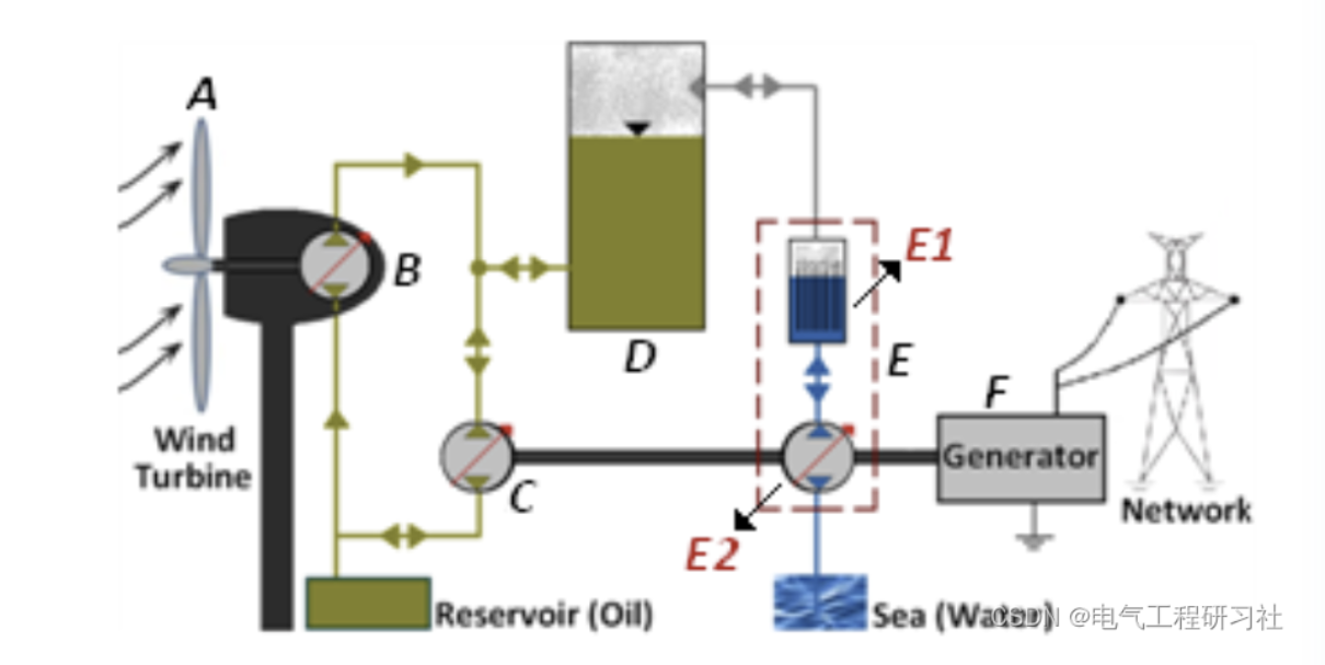 [1]中提出了一种新的风力涡轮机压缩空气储能(CAES)概念(图1)。将能量储存在高压(~200-350 bar)压缩空气中是有吸引力的,因为1)它具有相对较高的能量密度(~ 5MW * 8hr能量可以存储在500m中3船舶在35MPa)与抽水蓄能(约144,000米)相比3在100米处);2)具有可扩展性(能量容量随存储容器体积线性缩放);3)与电池相比性价比高,使用寿命长;4)它不依赖于传统CAES或泵送水力所需的特定地质地点。