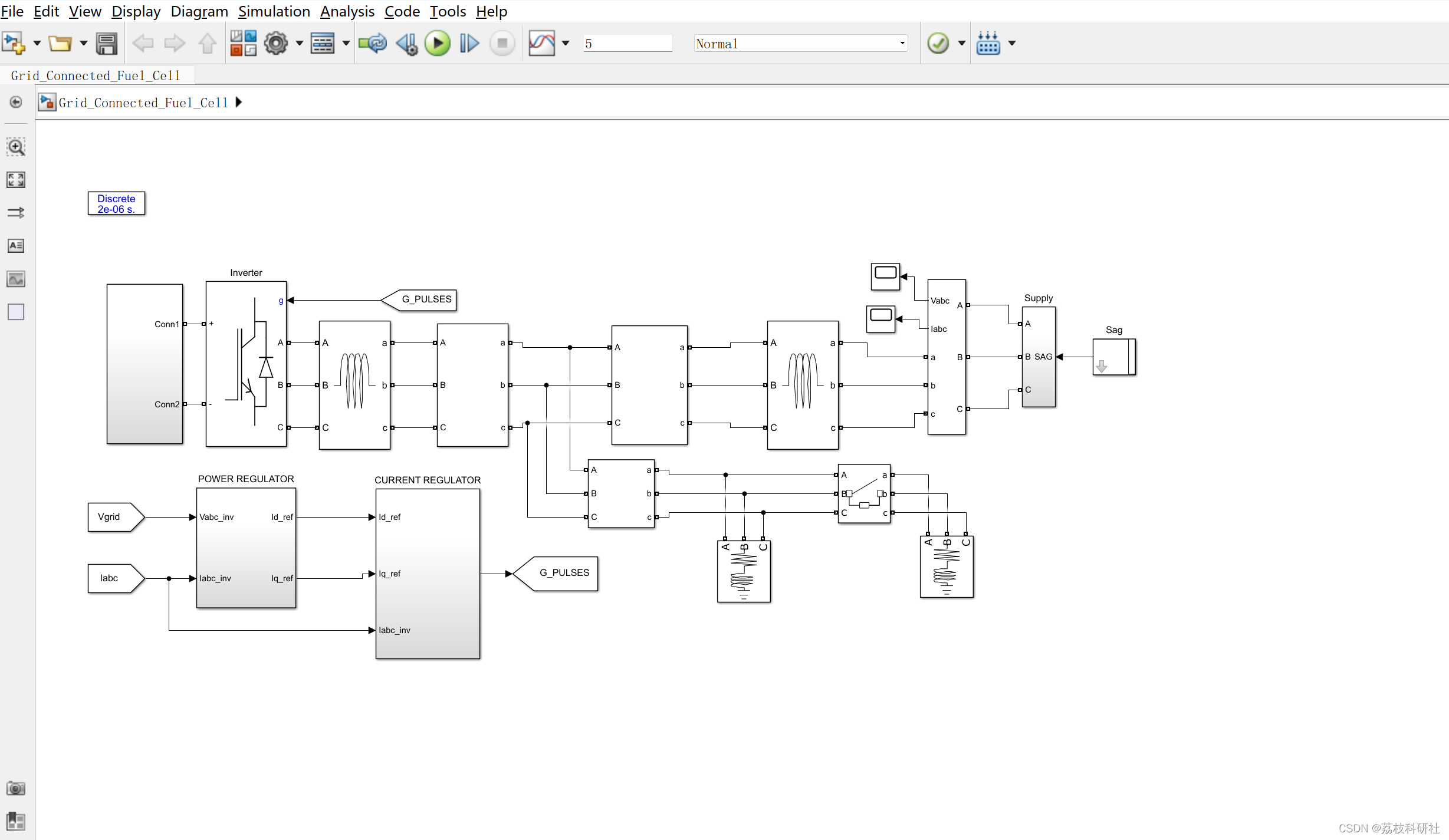 在该模型中,燃料电池连接到电网,并由基于功率的控制器控制。在此模型中,FC 以最大额定功率运行。