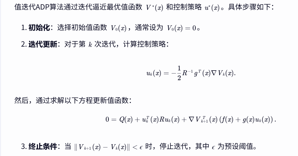 值迭代ADP是一种通过迭代逼近最优值函数和控制策略的方法。其核心思想是通过不断更新值函数和控制策略,使其满足HJB方程的近似解。