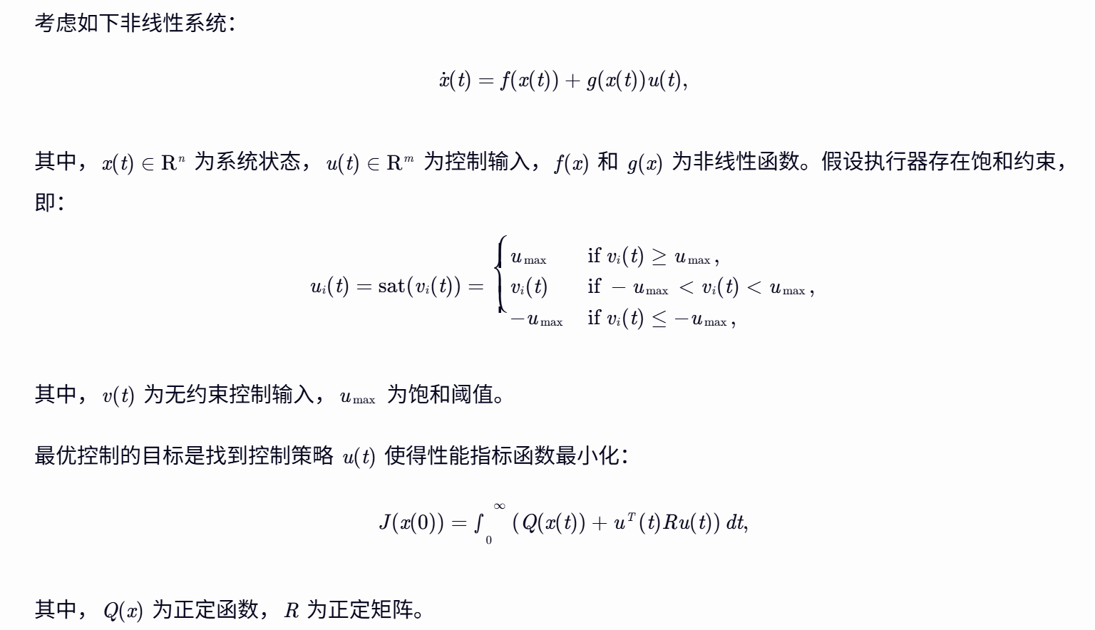 - HJB方程构建:在非线性系统控制中,哈密顿 - 雅可比 - 贝尔曼(HJB)方程是描述最优控制问题的核心方程。然而,由于非线性系统的复杂性和饱和执行器的存在,传统的二次函数方法无法准确构建与约束控制相关的HJB方程。因此,我们经过深入的理论分析和大量的数值实验,采用了一种合适的非二次函数。这种非二次函数能够充分考虑系统的非线性特性和执行器的饱和约束,从而成功构建出与约束控制紧密关联的HJB方程,为后续的研究奠定了坚实的理论基础。