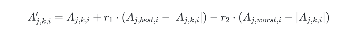 其中,r1和r2为[0,1]内的随机数,Aj,best,i和Aj,worst,i分别代表当前最优和最差解。该算法的优势在于无需特定控制参数(如遗传算法的交叉率),仅需设定种群规模和迭代次数,简化了参数调优过程。然而,其仍存在易陷入局部最优、收敛速度不足等问题。