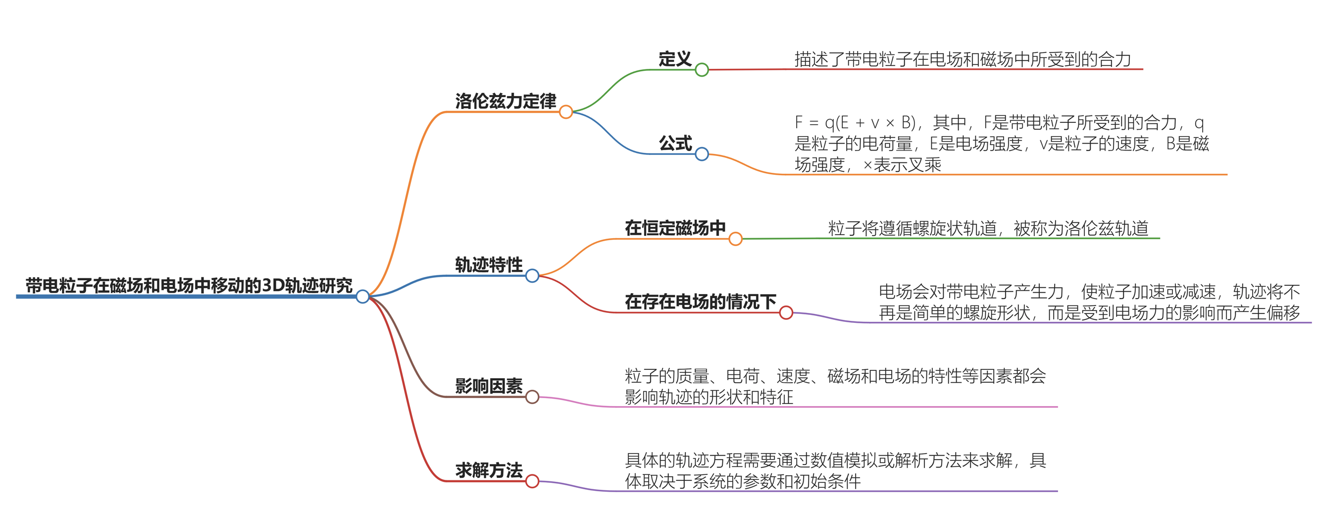 总结起来,带电粒子在磁场和电场中移动时的轨迹是一个复杂的问题,取决于粒子的初始条件以及磁场和电场的性质。通过洛伦兹力定律,可以描述其受到的合力,但具体的轨迹方程需要根据具体情况进一步分析和计算。