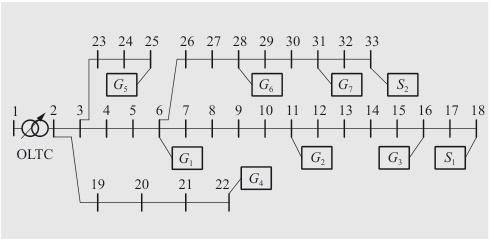 节点的辐射状分布和多分支特性导致潮流方向复杂,DG接入可能引发反向潮流和电压波动。例如,节点21和32的风机若容量过大,可能造成局部电压越限。
