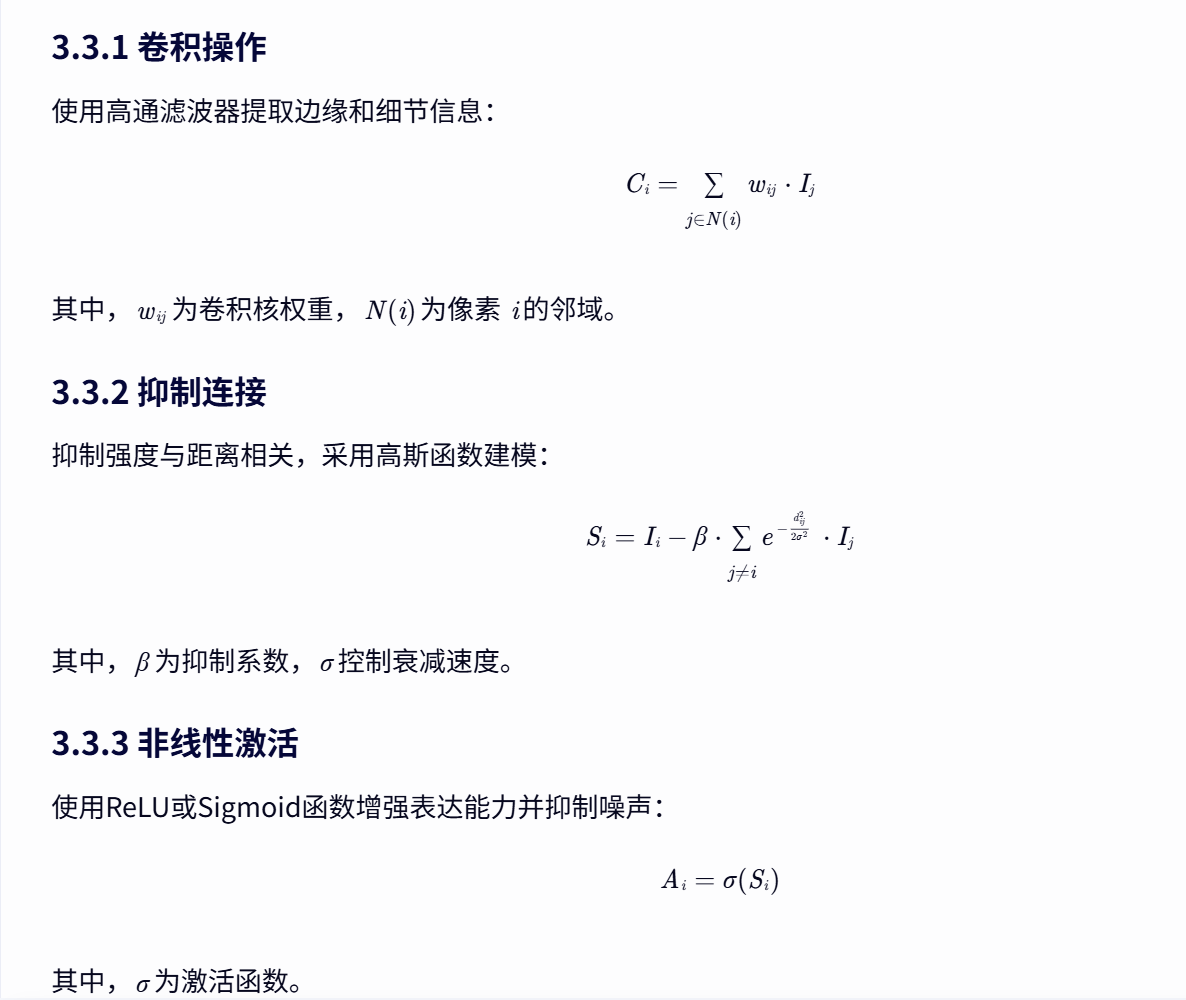 - 侧向抑制:源于神经生理学,指神经元活动抑制相邻神经元,在图像处理中可突出边缘并抑制噪声。