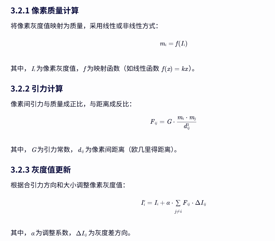 - 引力模型模块:计算像素间引力并更新灰度值;