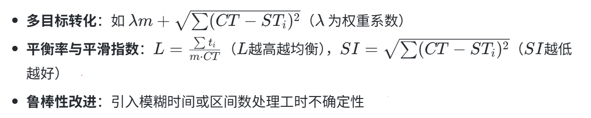 - SALBP-III:双目标优化(最小化m和CT),最大化平衡率并最小化平滑指数(SI)。