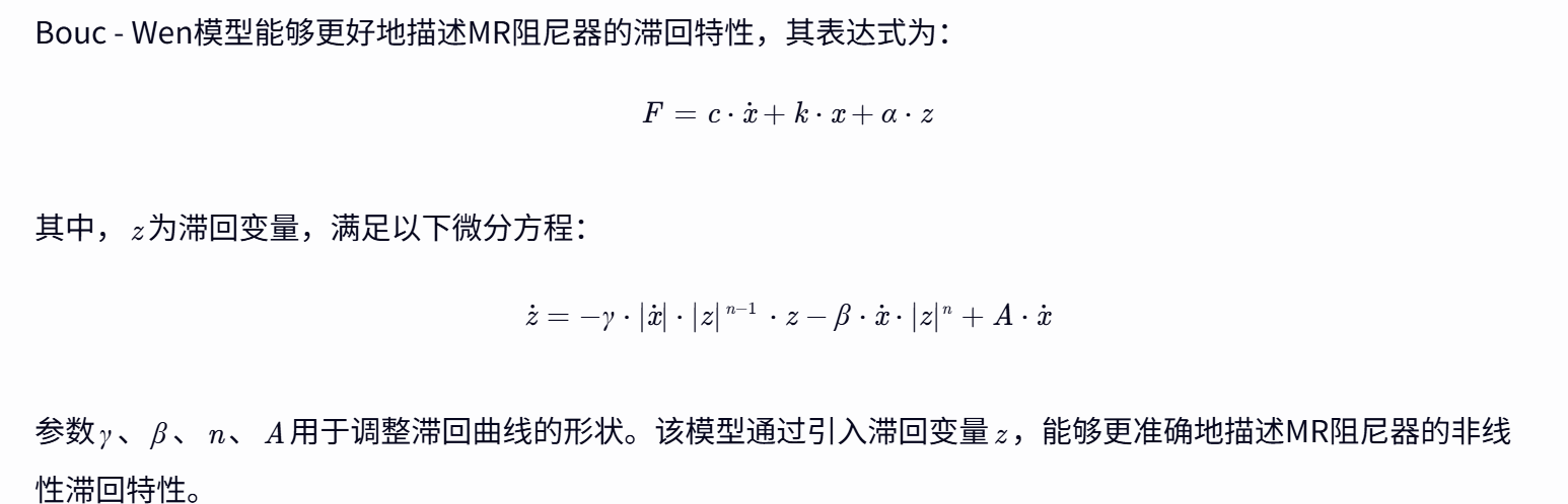 仿真研究是研究MR阻尼器非线性特性的另一种重要方法。通过在仿真软件(如MATLAB/Simulink、ANSYS等)中建立MR阻尼器的数学模型,输入激励信号,运行仿真模型,获取阻尼力随时间的变化曲线,分析其非线性特性。例如,以Bouc - Wen模型为例,在MATLAB中建立MR阻尼器的仿真模型,代码如下: