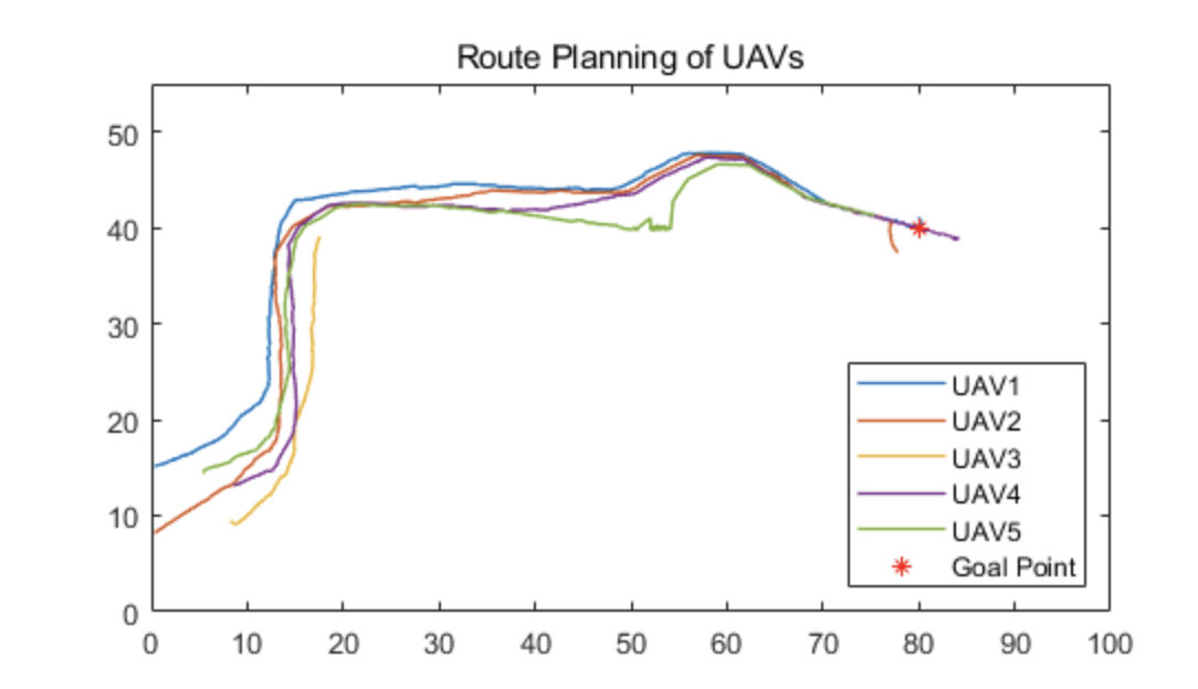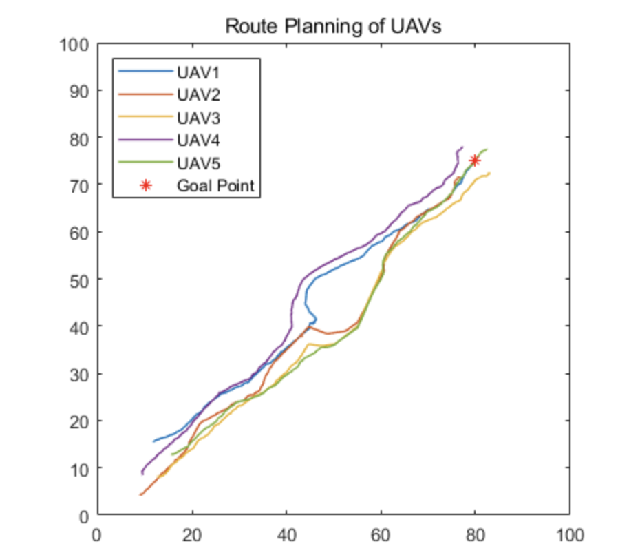- 无人机参数:5架无人机,初始位置随机分布,目标点为 (50,95,40)m,最大速度 6m/s;