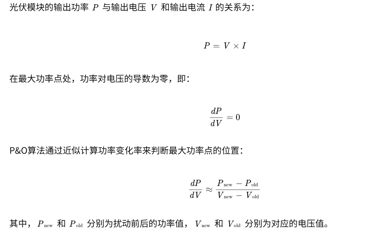 P&O算法通过周期性地扰动光伏模块的输出电压或电流,并观察输出功率的变化,来判断当前工作点是否位于最大功率点附近。具体步骤如下: