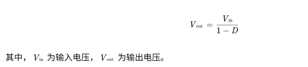 Boost变换器通过控制开关管的导通与关断,实现能量的储存与释放。当开关管导通时,电感储存能量;当开关管关断时,电感释放能量,通过二极管向负载供电。通过调节开关管的占空比 D,可控制变换器的输出电压: