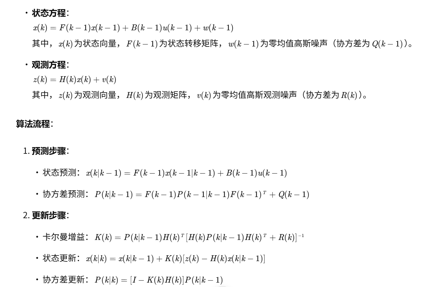 - 线性高斯假设:非线性系统需采用扩展卡尔曼滤波(EKF)或无迹卡尔曼滤波(UKF)。