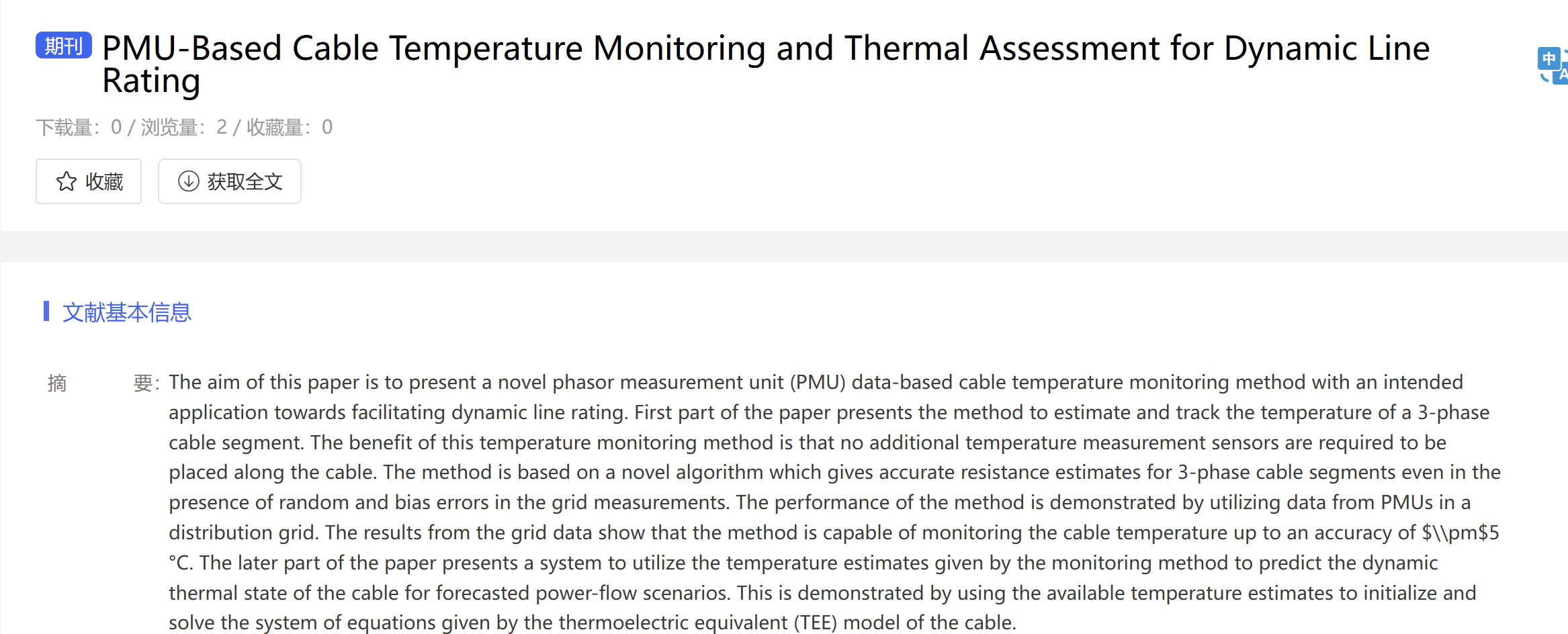 [1] Singh R S , Cobben S , Uk V .PMU-Based Cable Temperature Monitoring and Thermal Assessment for Dynamic Line Rating[J].Power Delivery, IEEE Trans. on (T-PWRD), 2021, 36(3).DOI:10.1109/TPWRD.2020.3016717.