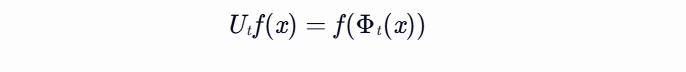 Koopman算子是一种无限维的线性算子,最初由Koopman在1931年提出。它作用于动力系统的可观测量(即系统状态的函数),将可观测量的演化过程线性化。具体而言,对于给定的动力系统,其状态空间为X,流映射为Φₜ: X → X,定义在连续时间t ∈ ℝ上。Koopman算子Uₜ作用于可观测量f: X → ℂ,满足: