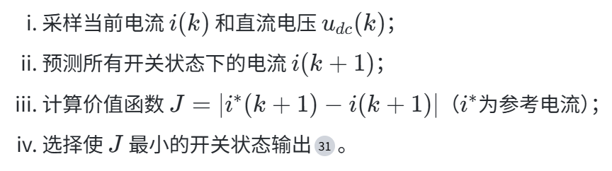 - 离散优化:利用电力电子器件的有限开关状态(三相整流器共8种电压矢量),预测下一时刻电流响应,通过价值函数评估最优开关状态。
